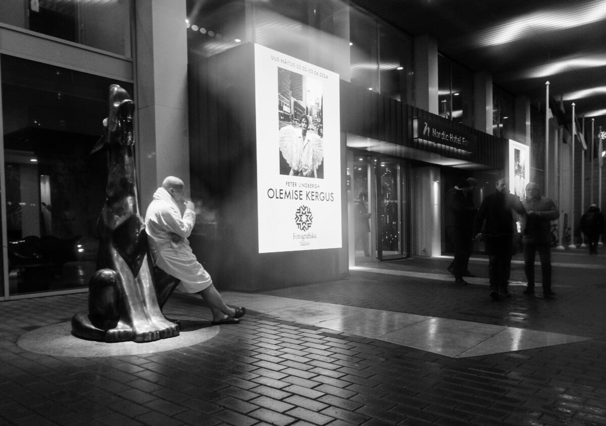 Ikka. See pilt on tehtud selle aasta veebruaris. Miskil imekombel siis lund maas polnud, aga oli kahtlemata tormine ilm ja vihma ladistas nagu oavarrest. Olin töölt tulles miskipärast tavapärasest rohkem motiveeritud ja haarasin fotoka, et teha üks tiir kesklinnas. Olin juba mõnda aega jalutanud, kuid miskit erilist silma ei hakanud ning olin juba üsna märjaks saanud. Hakkasin kodu poole jalutama, kui Nordic hotelli juures jäi eemalt silma keset vihmast ilma hommikumantlis suitsu nautiv mees.