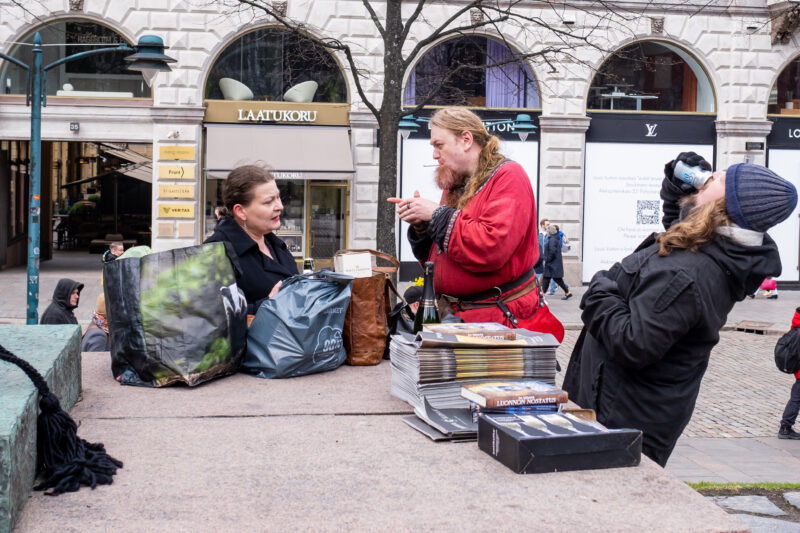 Pärastlõunal kogunesime Helsingi Oodi raamatukogus, et tutvuda sealsete tänavafotograafidega ja kohaliku tänavafotomaastikuga. Muidugi leidsime nii kokkupuutepunkte kui ka mõningaid erinevusi. Näiteks pole Soomes ühtset fotokogukonda nagu meil on välja kujunenud, pigem tegutsetakse üksi või väiksemates gruppides. Ühise huvi teemal jagunuks juttu veelgi kauemaks, kuid otsustasime siiski ka koos väikese jalutuskäigu teha ja vappupüha tähistamist tänavatel jäädvustada.